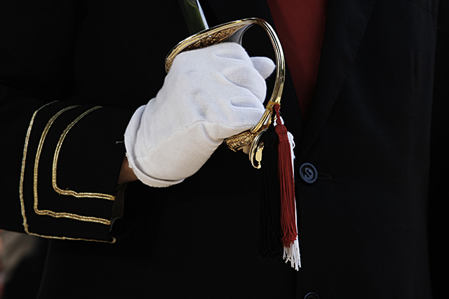 … en los sables de los mandos de la Compañía Olaberria lucen unos pompones con los colores sanmarcialeros?
