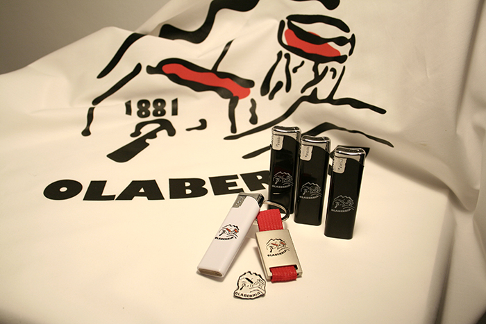 Duela urte batzuk Olaberria Konpainiak merchandising artikuluak ateratzea erabaki zuen bi helbururekin: batetik, konpainiako kideei, lagunei zein senitartekoei Olaberriako jantzi edo artikuluak eramateko aukera emateko; eta bestetik, diru-sarrera gehiago izateko San Martzial Alardearen antolakuntzan eta urtean zehar egiten ditugun jardueretan sortzen diren gastuak ordaintzen laguntzeko.